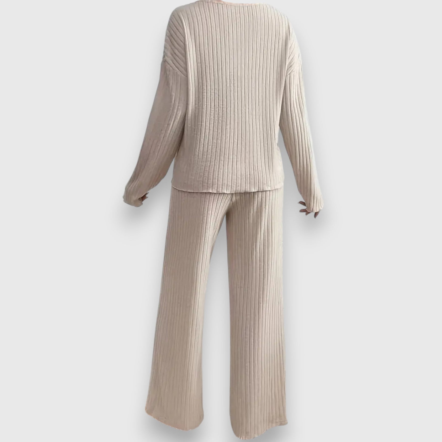 Mukava kaksiosainen asu V-pääntiellä ja pitkähihainen malli. Täydellinen rentoihin kevätpäiviin.