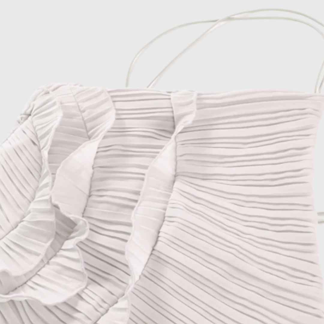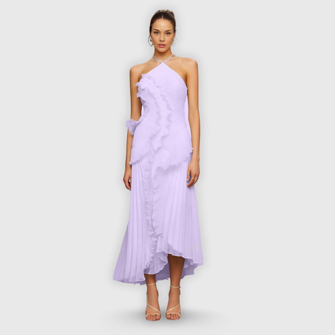 Virginia in käsintehty midime herkän laventelin sävyssä, joka epäsymmetrisen leikkauksen ja laskeutuvien volankien aikana jokaista liikettäsi. Hienostunut halterneck-yksityiskohta ja kauttaaltaan pliseerattu kangas antavat mekolle ylellistä keveyttä – täydellinen erityisiin hetkiin, joissa tyyli ja eleganssi ovat tärkeintä.